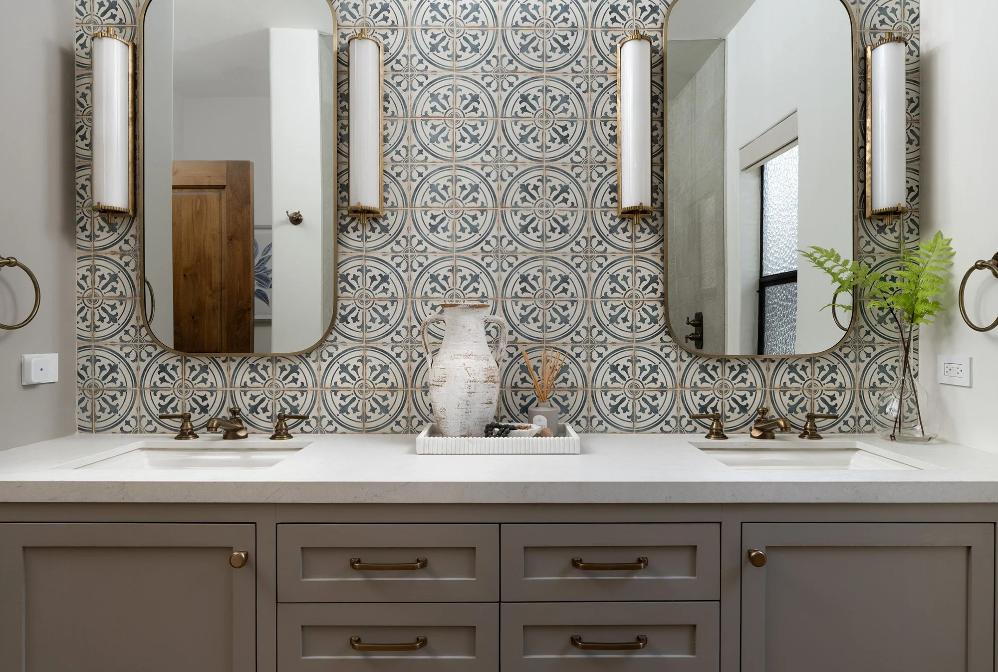 Separating the two bedrooms is a spa-inspired bathroom, boasting a double sink and oversized shower with multiple shower heads—transforming your daily routine into a rejuvenating experience.