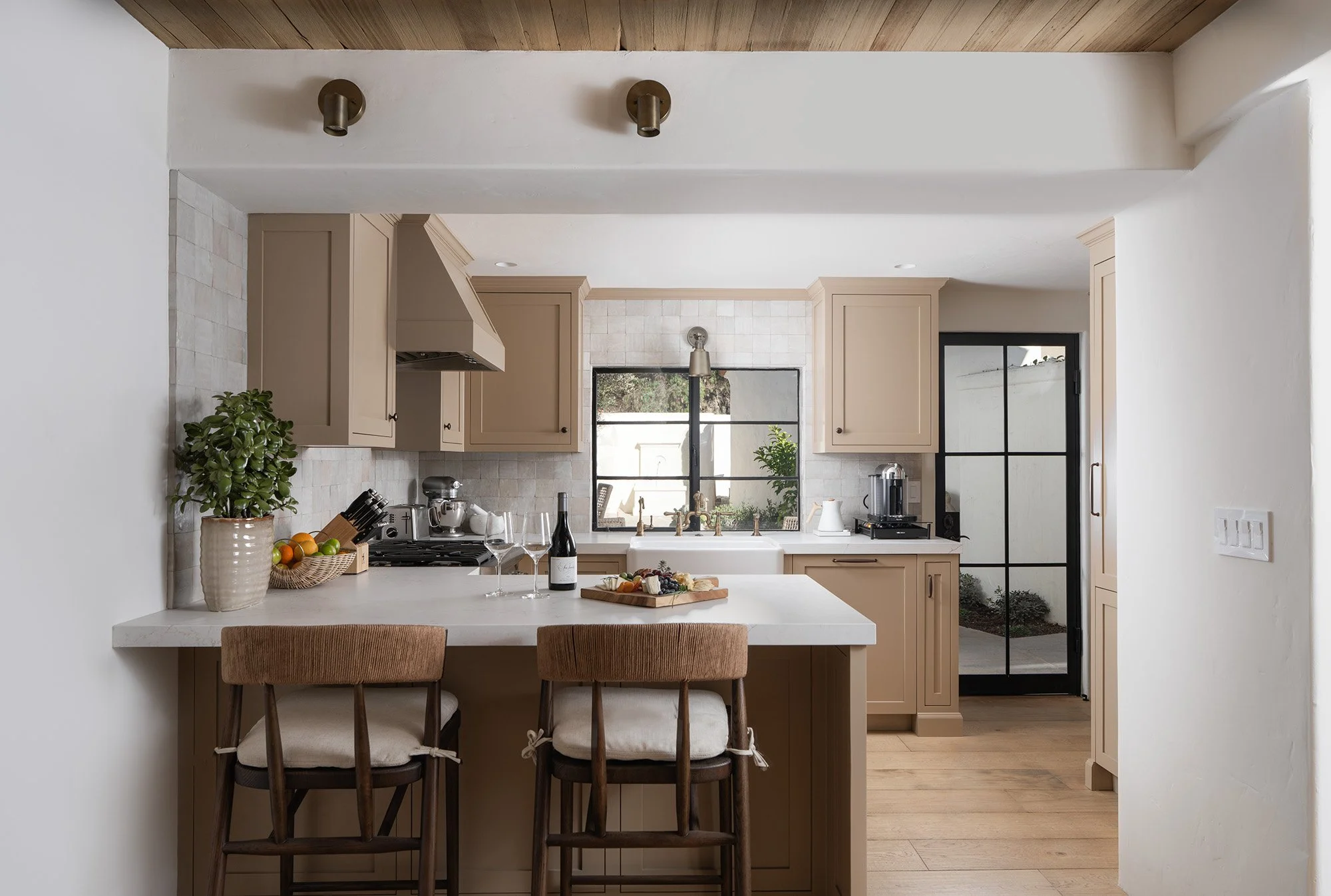 A stylish, inviting two-story retreat featuring abundant natural light, calming earth tones, olive tree views, and a lofted living area.