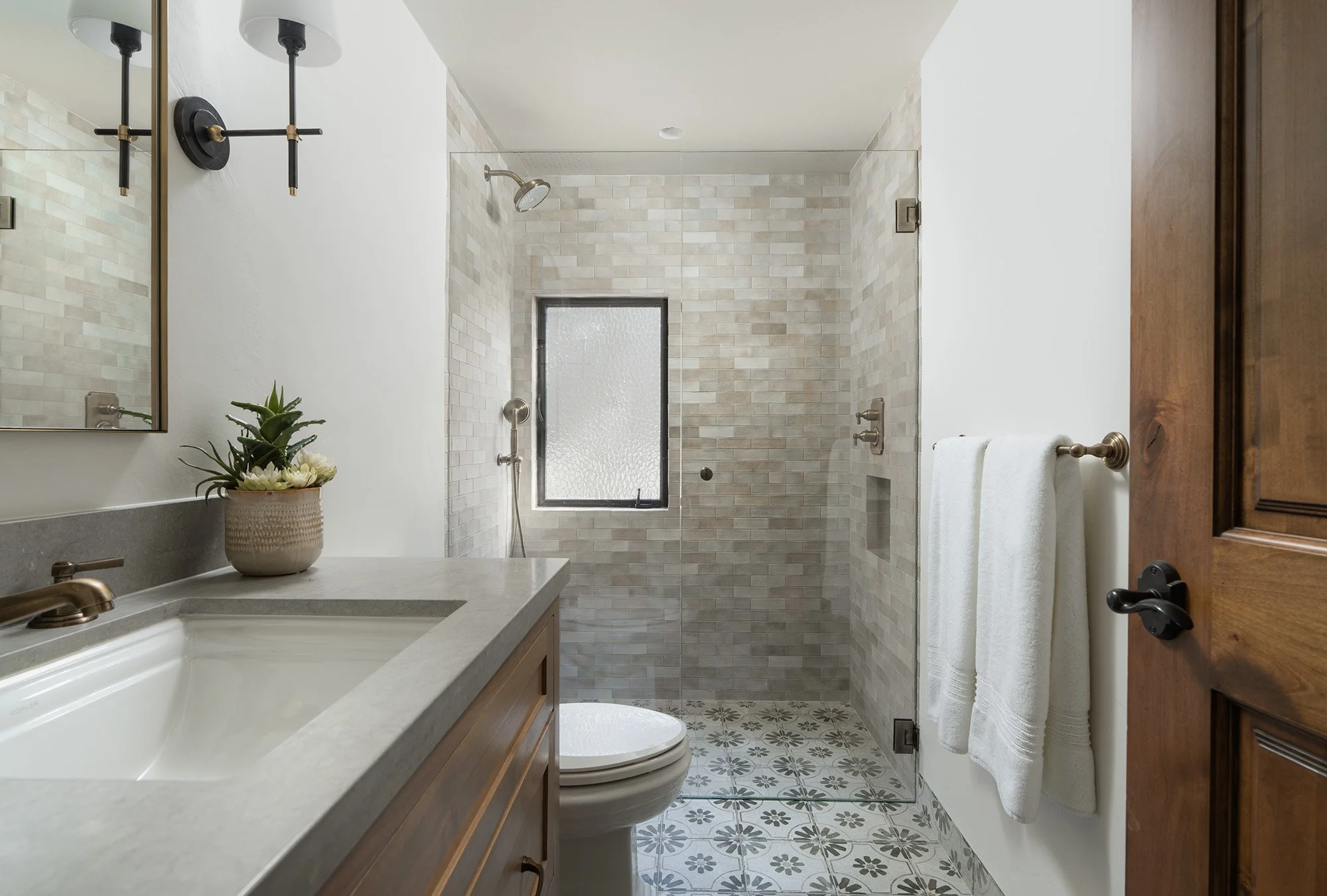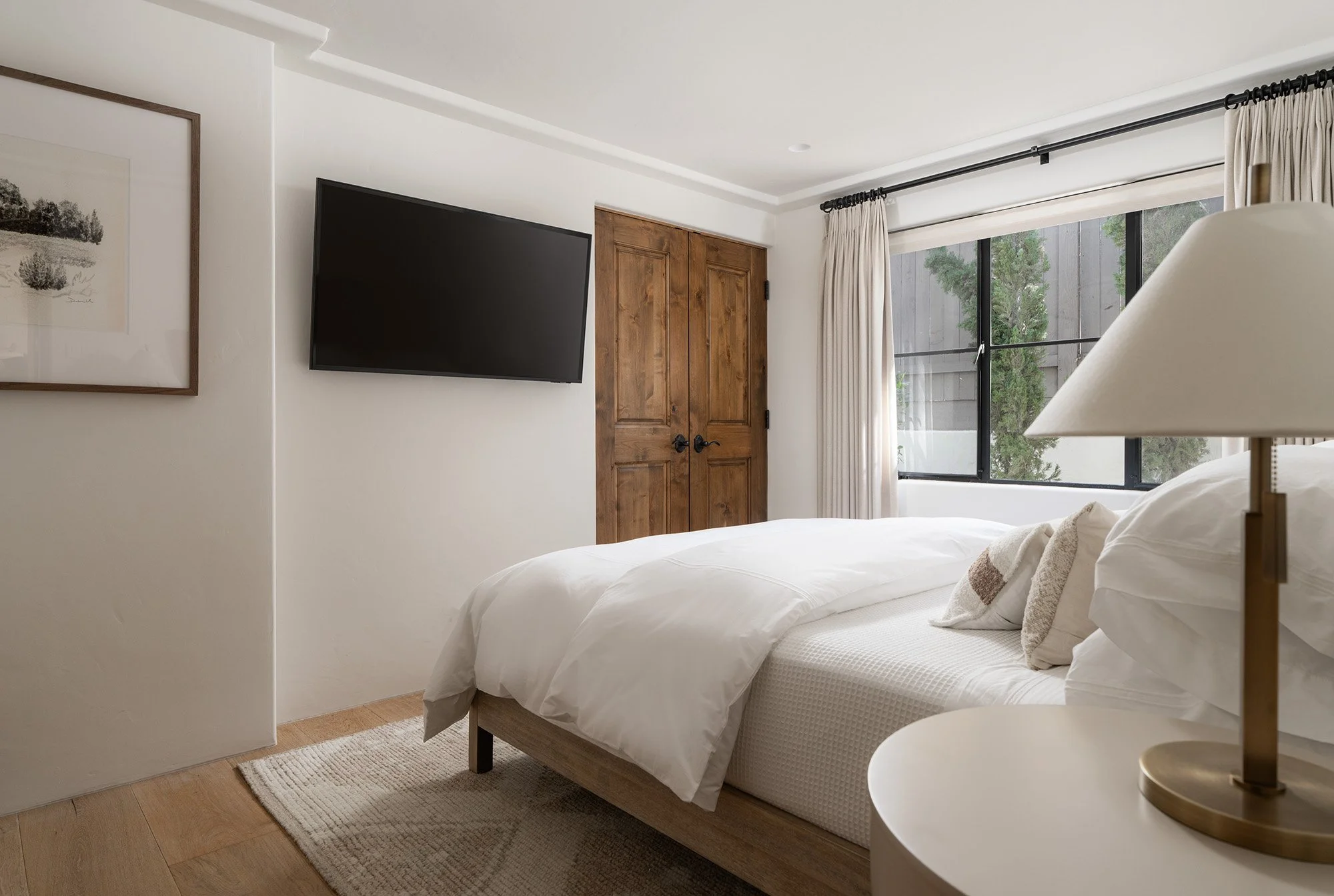 Further inviting peace and restoration is the serene bedroom, wrapped in soft tones and luxurious linens, along with the beautifully designed bathroom, showcasing indulgent amenities and stunning tilework.